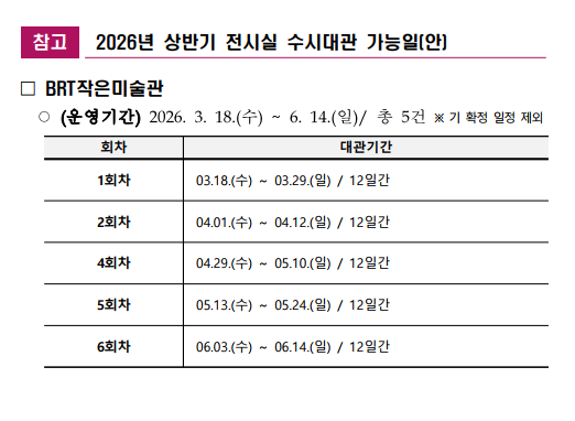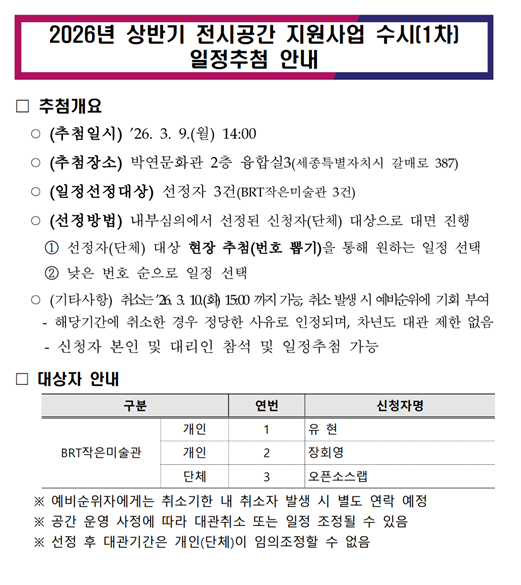 2026년 상반기 전시공간 지원사업 수시(1차) 일정 추첨 안내