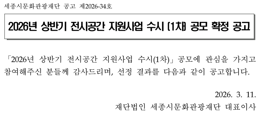 2026 상반기 전시공간 지원사업 수시(1차) 공모 확정 공고