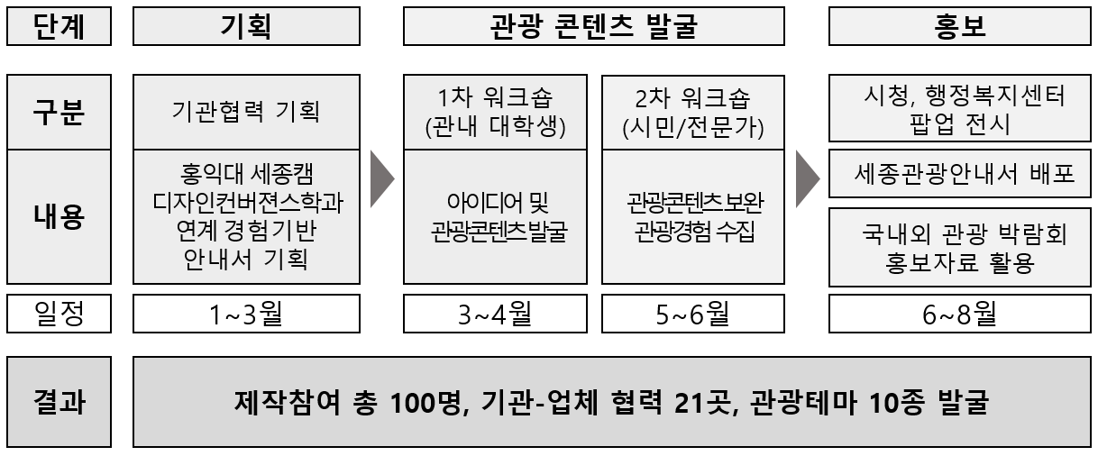 관내 대학인 홍익대 세종캠퍼스와 협력하여 변화하는 관광 트렌드를 반영하기 위해 MZ세대의 참신한 아이디어를 발굴하고, 세종시민과 기관종사자 등 전문가와 함께 10개 테마별 워크숍을 운영하며 관광코스를 기획했습니다.