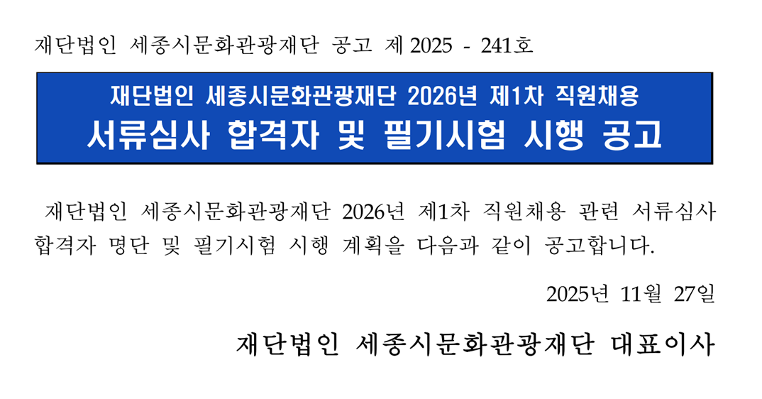 (재)세종시문화관광재단 2026년 제1차 직원 채용 서류심사 합격자 및 필기시험 시행 공고