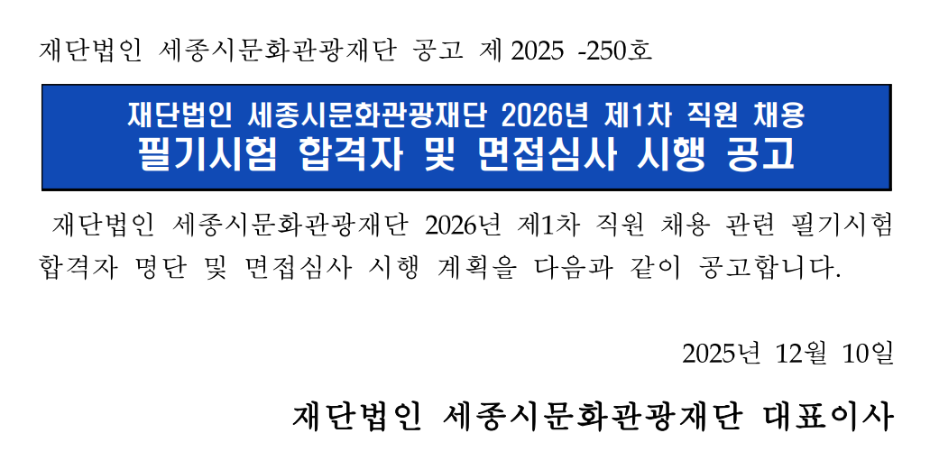 (재)세종시문화관광재단 2026년 제1차 직원 채용 필기시험 합격자 및 면접심사 시행 공고