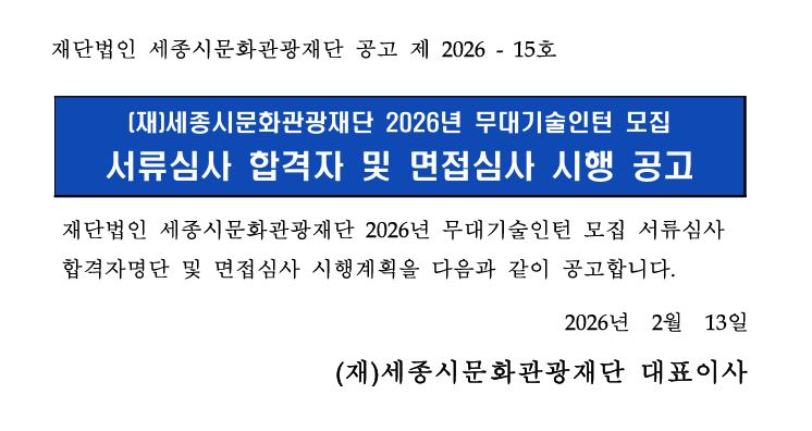 (재)세종시문화관광재단 2026 무대기술인턴 모집 서류합격 및 면접시행 공고