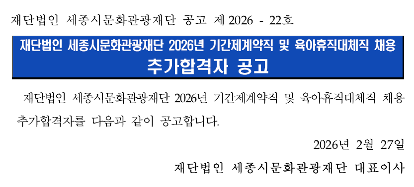 (재)세종시문화관광재단 2026년 기간제계약직 및 육아휴직대체직 채용 추가합격자 공고
