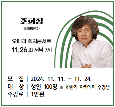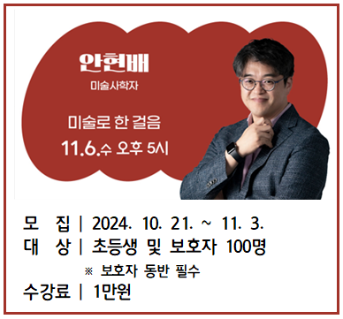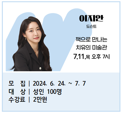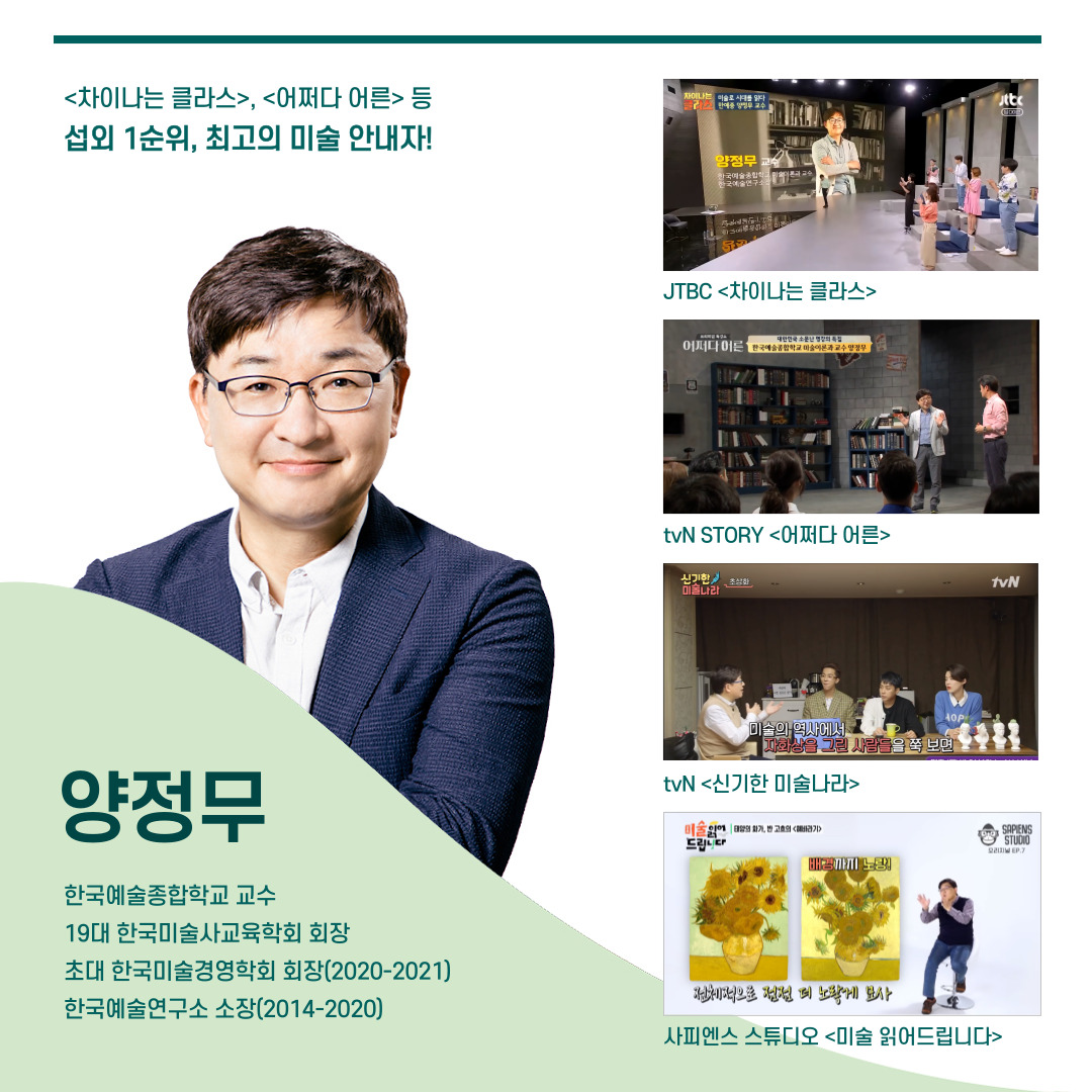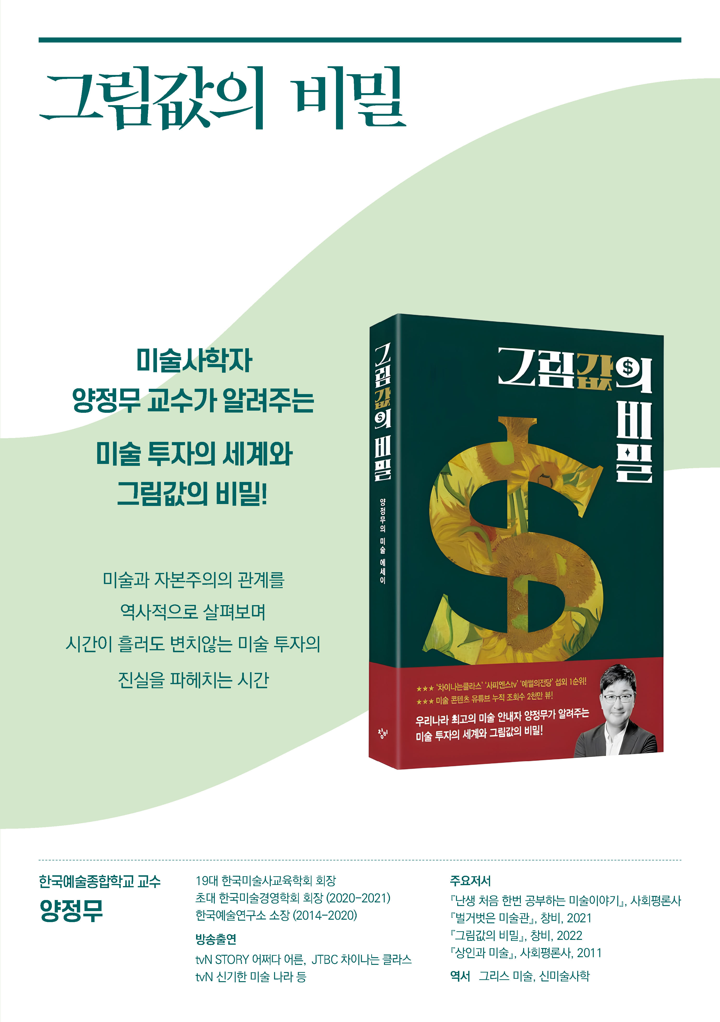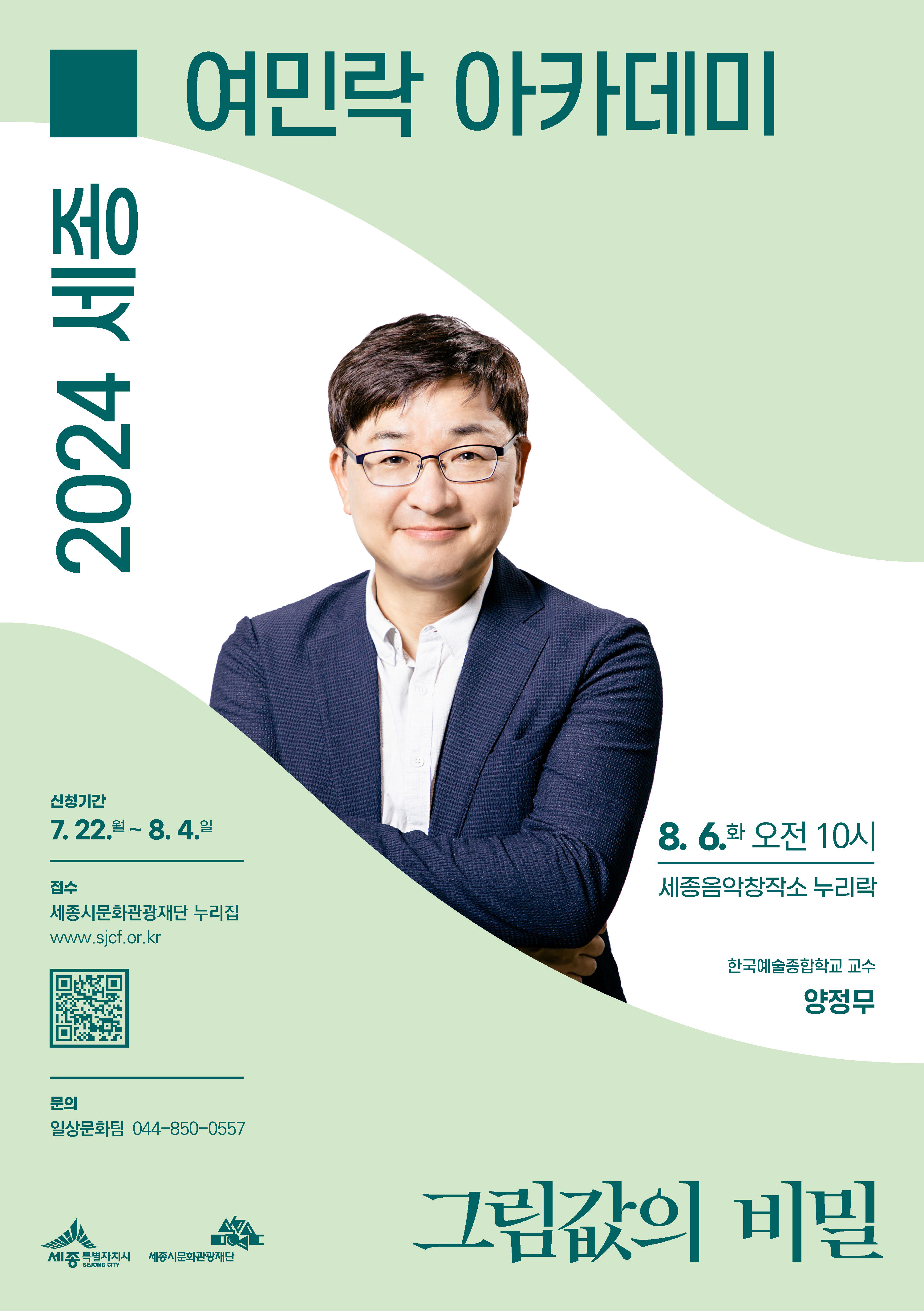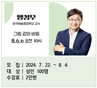 ■ 하반기 특별강의 ■ 그림값의 비밀 [강좌소개] ○ 일시 : 2024. 8. 6.(화) 오전 10시~11시 30분 ○ 장소 : 세종음악창작소 누리락(박연문화관 지하 2층) ○ 강사 : 한국예술종합학교 교수 양정무 ○ 소개 : 미술사학자 양정무 교수가 알려주는 미술 투자의 세계와 그림값의 비밀! 미술과 자본주의의 관계를 역사적으로 살펴보며 시간이 흘러도 변치않는 미술 투자의 진실을 파헤치는 시간 [신청기간] 2024. 7. 22.(월) ~ 8. 4.(일) ※ 프로그램 내용 및 일정은 변동 가능하며 변동사항 발생 시 홈페이지에 공지됩니다. ※ 신청 및 결제 취소는 교육 시작일 이전에만 취소가 가능하며, 이후에는 취소가 불가 합니다. ※ 문의 : 세종시문화관광재단 일상문화팀 ☎044-850-0557
